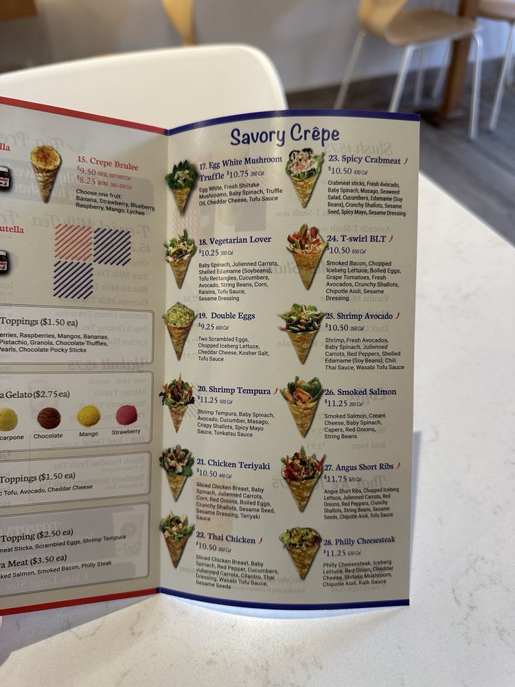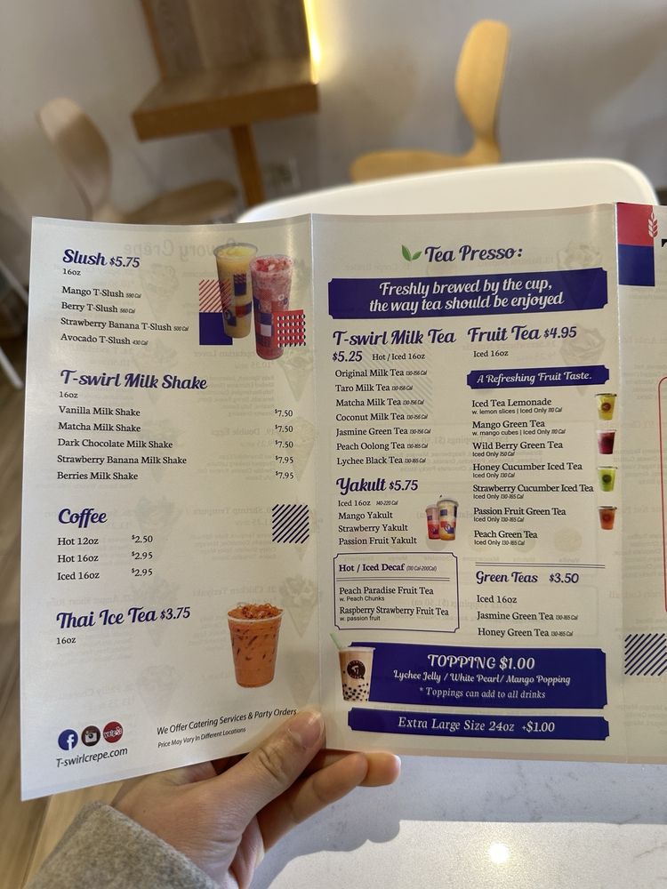 Introducing the menu at T-swirl Crepe - Elmhurst, a delightful haven for dessert lovers located at 8110 Broadway, Elmhurst, NY. This charming establishment recently opened its doors, quickly becoming a local favorite for both sweet and savory crepes. New additions like the Cream Brulee and Lychee Rose Mille Crepe Cake are must-tries, showcasing vibrant flavors and exquisite presentation.